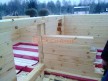 Главная проблема брусовых домов — усадка, после которой в срубе возникают щели в палец толщиной. Так случается, когда строят из дешёвого сырого бруса, плотно сажая венцы на гвозди (деревянные или металлические — без разницы). Мы же тратим время на сборку со сверлением. То есть сажаем брусья на металлические гвозди и в верхнем венце высверливаем отверстие под каждую шляпку. Поэтому во время усадки бруски не зависают на гвоздях, деформируя сруб, а свободно по ним скользят. Технология трудо- и времязатратная, но результат потрясающий — даже в срубах из сырого бруса практически нет щелей.
