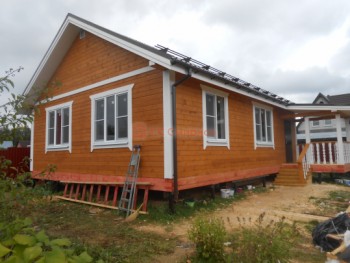 Из профилированного сухого бруса 9х14см, 14х14 см или 14х19 см. Сборка сруба в теплый угол на нагеля или гвозди 200 мм со сверлением отверстия в верхнем брусе (в зависимости от вида бруса).