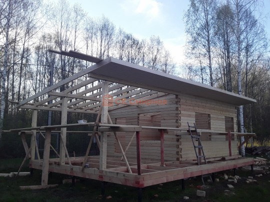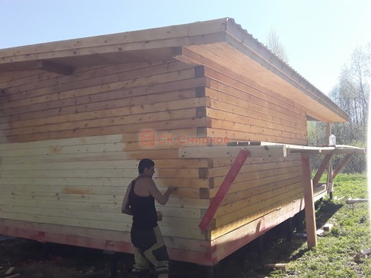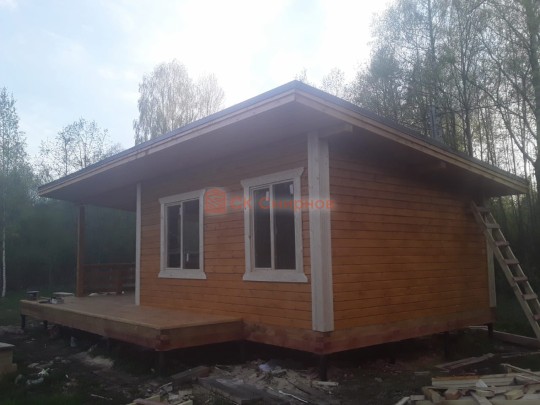 Из профилированного сухого бруса 9х14см, 14х14 см или 14х19 см. Сборка сруба в теплый угол на нагеля или гвозди 200 мм со сверлением отверстия в верхнем брусе (в зависимости от вида бруса).