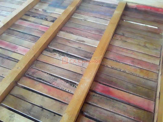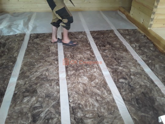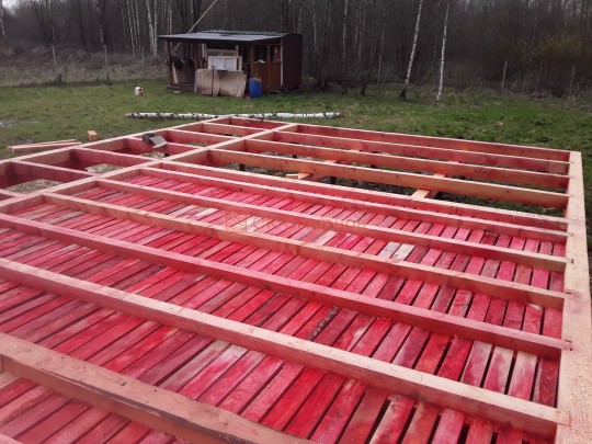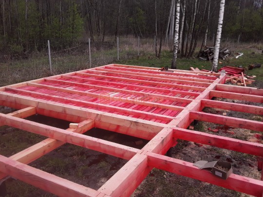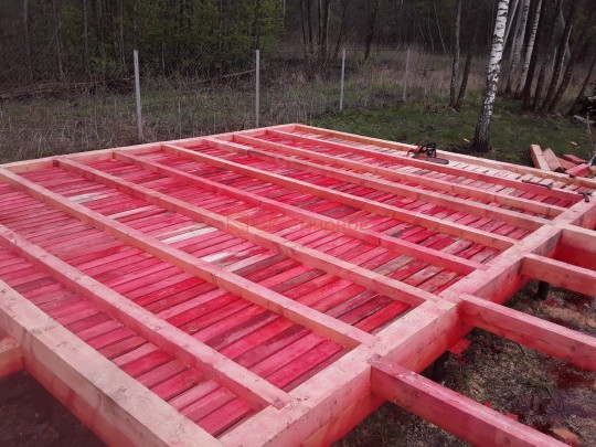 Лаги, обвязку и черновой пол обрабатываем раствором био огне защитой ( зимой оговариваются отдельные условия ), в основном красный цвет, но может быть и бесцветная обработка.