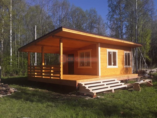 Из профилированного клееного бруса 9х14см, 14х14 см или 14х19 см. Сборка сруба в теплый угол на нагеля или гвозди 200 мм со сверлением отверстия в верхнем брусе (в зависимости от вида бруса).