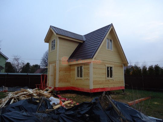 Из профилированного сухого бруса 9х14см, 14х14 см или 14х19 см. Сборка сруба в теплый угол на нагеля или гвозди 200 мм со сверлением отверстия в верхнем брусе (в зависимости от вида бруса).