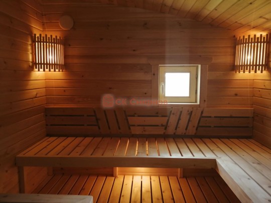 Такие бани в VIP комплектации отличает особый подход. Сборка осуществляется на участке с предельным вниманием к деталям: пологи в парной украшаются декоративной спинкой, вешаем уличные светильники, люстру в комнату отдыха, уютные абажуры в сауну. В помывочной во весь пол положен пластиковый поддон. Поставлены стеклянные двери, которые не деформируются от жары и воды.
