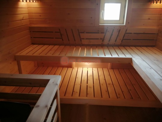В комплект бани входит стол и две скамейки из доски 19мм, как на фото. Есть комплекты из более толстой доски а также из кедра, смотрите в доп комплектации.