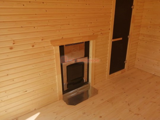 Установка печи Теплодар Русь сетка 12 л панорама ( со стеклянной дверцей ), трубы сэндвич, проходы и зонт входят в стоимость бани. Экран металлический через стену. На полу кладется кирпич, базальтовый картон, минерит. На стенах базальтовый картон, минерит, через втулки прикручивается минерит. Ссылка на сайт производителя https://www.teplodar.ru/catalog/detail/rus_setka_12_l_panorama/