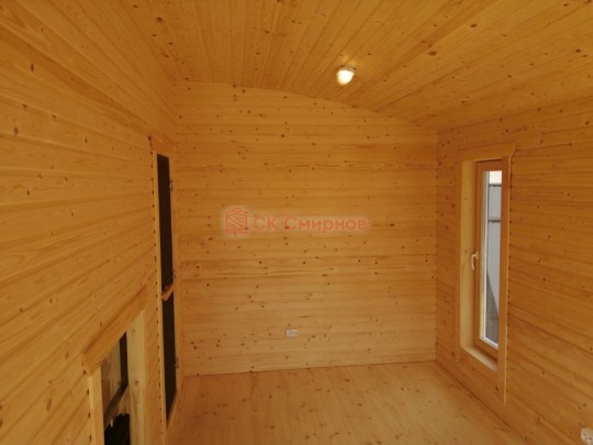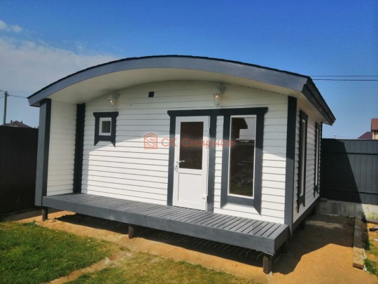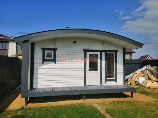 В нашем каталоге каркасных бань есть несколько очень красивых проектовавторских бань. В июне 2020 мы завершили строительство одной из них. Это одноэтажная баня каркасной сборки с округлой крышей, террасой, высокими панорамными окнами и роскошной парной, обшитой ароматнейшим кедром. Размер 5 на 5 метров. Внутри разместились комната отдыха, парная, помывочная с душевой системой и санузел, который по совместительству является бойлерной.
